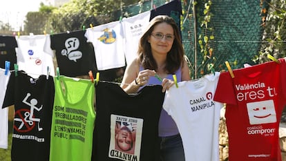 Mónica Oltra nació de nalgas un 20 de diciembre en una ciudad al oeste de Alemania donde vivían sus padres, miembros del PCE y exiliados. En su caso, fue un exilio por amor, ante la imposibilidad de vivir juntos en España porque su padre se había casado anteriormente y no se podía divorciar. Por eso, Mónica Oltra Jarque fue, hasta 1981, Mónica Jarque Tortajada. El hecho fue utilizado por el consejero de Bienestar Social Juan Cotino, en 2010, para intentar insultarla: “Tendría vergüenza, si fuera padre, de tener una hija como esta, pero como probablemente ella no lo conozca...”, dijo después de que, como tantas veces, la política de Compromís señalara la implicación de algunas de las empresas del grupo familiar de Cotino en la trama Gürtel por la que después fueron condenados sus miembros. Esa ha sido una de las facetas más conocidas de Mónica Oltra entre 2007 y 2015, la de convertirse en una activista contra la corrupción, pero desde la tribuna en la que se hizo famosa a base de camisetas. “No nos falta dinero, nos sobran chorizos” fue uno de los lemas utilizados, aunque la que lució con la cara de Camps y la leyenda “Wanted. Only alive” (”Se busca. Solo vivo”) fue la que la llevó a todos los telediarios.