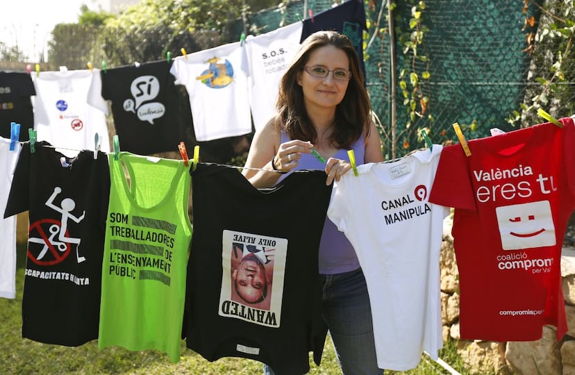 Mónica Oltra nació de nalgas un 20 de diciembre en una ciudad al oeste de Alemania donde vivían sus padres, miembros del PCE y exiliados. En su caso, fue un exilio por amor, ante la imposibilidad de vivir juntos en España porque su padre se había casado anteriormente y no se podía divorciar. Por eso, Mónica Oltra Jarque fue, hasta 1981, Mónica Jarque Tortajada. El hecho fue utilizado por el consejero de Bienestar Social Juan Cotino, en 2010, para intentar insultarla: “Tendría vergüenza, si fuera padre, de tener una hija como esta, pero como probablemente ella no lo conozca...”, dijo después de que, como tantas veces, la política de Compromís señalara la implicación de algunas de las empresas del grupo familiar de Cotino en la trama Gürtel por la que después fueron condenados sus miembros. Esa ha sido una de las facetas más conocidas de Mónica Oltra entre 2007 y 2015, la de convertirse en una activista contra la corrupción, pero desde la tribuna en la que se hizo famosa a base de camisetas. “No nos falta dinero, nos sobran chorizos” fue uno de los lemas utilizados, aunque la que lució con la cara de Camps y la leyenda “Wanted. Only alive” (”Se busca. Solo vivo”) fue la que la llevó a todos los telediarios.