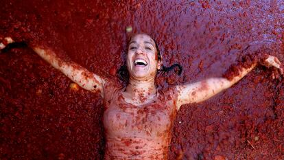 Ella y su pareja están teñidos de rojo y no temen la proximidad del paso de los camiones, la zona cero de la batalla, desde donde se arrojan y descargan los tomates en la calle a modo de munición. “Apunta, apunta que hay tomates que no están muy maduros”, pide Susana, una vecina de un pueblo cercano a la población valenciana, que ha celebrado la 75ª edición de sus fiestas populares, de gran proyección internacional. El impacto de un oportuno tomate sobre la cabeza de este informador confirma la veracidad del comentario. No obstante, la inmensa mayoría de los tomatazos no causa ningún daño, como demuestra la masiva participación de la gente que pide más, que jalea y provoca a los voluntarios asegurados con arneses en los enormes remolques de los camiones que parecen contenedores de sopa de tomate a última hora del recorrido.