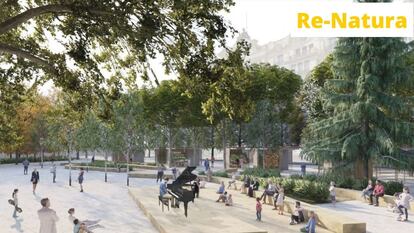 El protagonismo del diseño es la renaturalización. El arbolado, la vegetación, el agua y los suelos permeables apoyarán la biodiversidad, y regularán las condiciones de temperatura y humedad de la plaza. De hecho, el diseño de Re-Natura apuesta, precisamente, por dotar a la plaza de abundante presencia vegetal, aunque se ha previsto que muchas de las especies sean de hoja caduca, de manera que se garantice la visibilidad de, por ejemplo, las actividades falleras, y que, a la vez, generen abundante zonas de sombra durante los meses más calurosos.