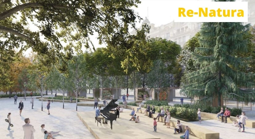 El protagonismo del diseño es la renaturalización. El arbolado, la vegetación, el agua y los suelos permeables apoyarán la biodiversidad, y regularán las condiciones de temperatura y humedad de la plaza. De hecho, el diseño de Re-Natura apuesta, precisamente, por dotar a la plaza de abundante presencia vegetal, aunque se ha previsto que muchas de las especies sean de hoja caduca, de manera que se garantice la visibilidad de, por ejemplo, las actividades falleras, y que, a la vez, generen abundante zonas de sombra durante los meses más calurosos.