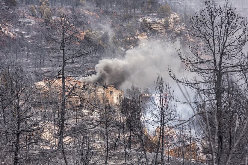 El fuego destruye una aldea de Teruel, pero la humedad de la tarde contiene su avance