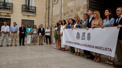 La presidenta de las Cortes Valencianas, Llanos Massó, de Vox, y el resto de su grupo parlamentario, han guardado este lunes tres minutos de silencio en rechazo al último caso de violencia machista —una mujer ha sido asesinada en Antella a manos de su pareja— separados de la pancarta oficial de la concentración. En el cartel, tras el que sí se han colocado el resto de grupos con representación en la Cámara, podía leerse: “Les Corts contra la violencia masclista [Las Cortes contra la violencia machista]”.