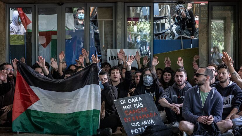 Varias decenas de estudiantes que conformaban la acampada propalestina de la Universitat de València (UV), la primera de las que luego se han sucedido por otros campus de España, han dado un paso más en su protesta y se han encerrado este jueves de madrugada en el interior de la facultad de Filosofía. Desde el lunes 29 de abril estaban acampados en los jardines del centro. Ahora han levantado unas barricadas con sillas mesas, expositores, colchonetas, expositores y enseres diversos en el interior de la facultad para impedir el acceso a personal de seguridad privada y de administración y al profesorado y alumnado de Filosofía y Ciencias de la Educación. “No nos marcharemos, mientras no se atiendan nuestras peticiones”, ha señalado Ignacio Oliver, miembro de la asamblea, que se ha quedado en el exterior para atender a los medios y dar apoyo a los estudiantes del interior.
