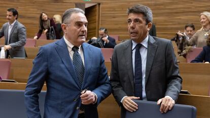 El presidente valenciano, Carlos Mazón, y los diputados del PP y Vox han mostrado este miércoles una gran sintonía en la sesión de control de las Cortes Valencianas. Incluso, por momentos, parecía mayor que cuando eran socios de gobierno hasta el pasado verano. No se ha oído ningún reproche de la formación de extrema derecha al que hasta ahora era su diana en la Generalitat, el vicepresidente para la reconstrucción de la dana, Francisco José Gan Pampols. Tampoco el exmilitar ha hecho ninguna mención al cambio climático, aunque le han preguntado por qué ya no lo menciona al referirse a las causas de la dana, como hacía antes del pacto de Mazón con Vox para aprobar los presupuestos de la Generalitat.