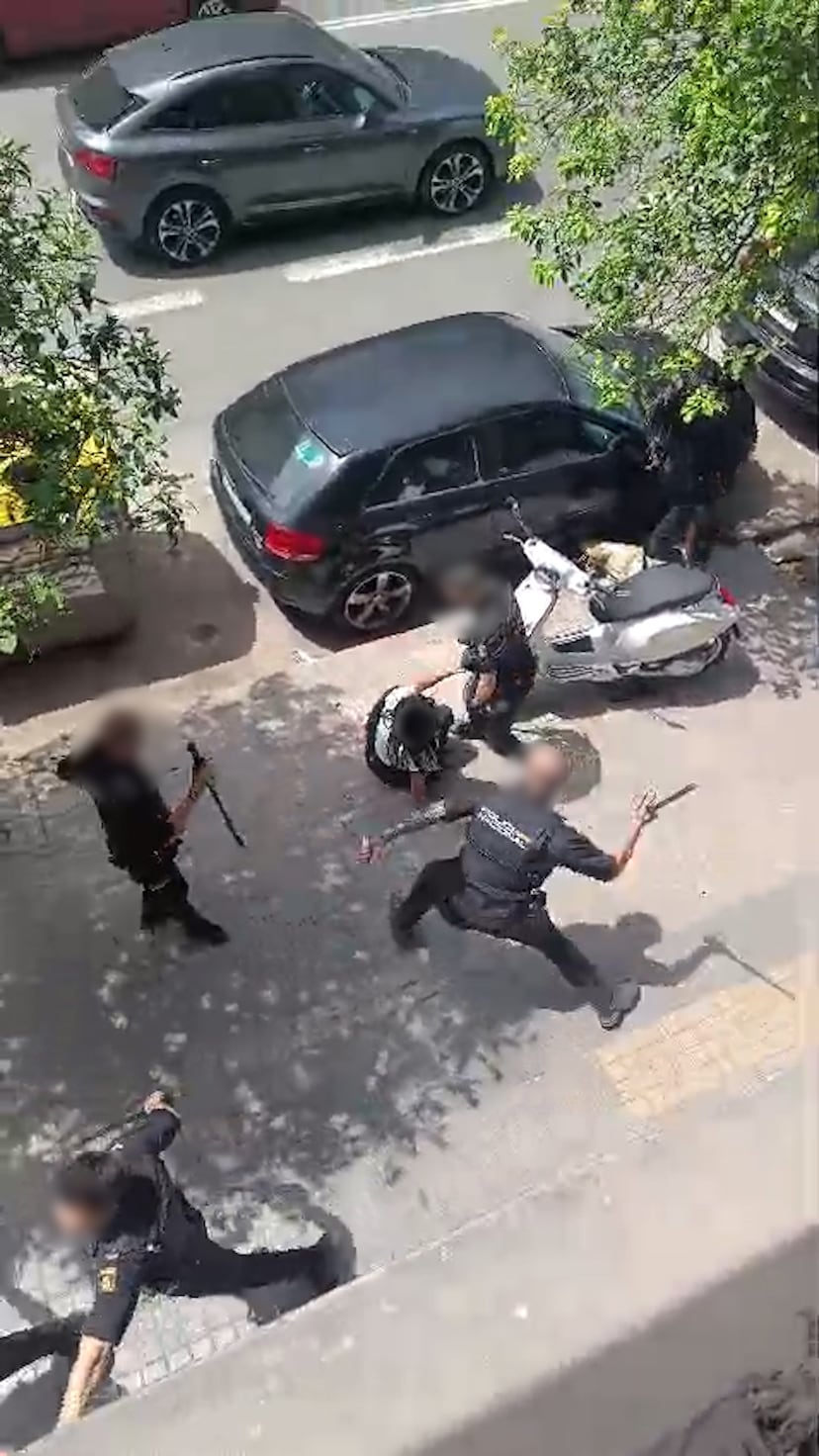 En otro de los videos, grabado desde la acera de enfrente, varios agentes golpean a un hombre que empieza a correr y le persiguen de cerca. En las imágenes se ve cómo uno de los agentes trata de darle una patada. Pocos metros más adelante le empujan con fuerza dentro de un portal y ya no se le ve más.