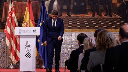 El presidente de la Generalitat valenciana, Carlos Mazón, ha reconocido este miércoles en una declaración institucional que ha pronunciado por el primer aniversario de la dana, en la que 229 personas perdieron la vida, que hace un año “hubo cosas que debieron funcionar mejor” y ha pedido reflexionar “ante el desamparo que sintieron tantos valencianos” ese día y los posteriores. Ha pronunciado esta declaración en el Saló de Corts del Palau de la Generalitat, un espacio para actos solemnes, después de guardar un minuto de silencio, rodeado de todo su gobierno, de los presidentes de las diputaciones provinciales, de alcaldes del PP y de cargos del segundo y tercer escalón de la Administración valenciana, que han cerrado el discurso de Mazón con un largo aplauso. No había previsto invitados de fuera de la Administración.