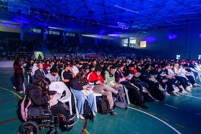 El ambiente parece inspirado en esa máxima clásica de enseñar deleitando. Dos jóvenes arquitectos explican su proyecto de crear parques en la ciudades en el que los usuarios más jóvenes participan en su concepción y diseño para ajustarlos más al signo de los tiempos. ¿Por qué no adaptar los espacios de los columpios y toboganes a la práctica del parkour? Los dos jóvenes predican con el ejemplo y se exhiben con dos inesperadas piruetas en el escenario que celebran los cerca de 900 estudiantes de centros educativos de municipios valencianos afectados por la dana del pasado año, como Paiporta, Algemesí, Alfafar, Catarroja, Valencia o Sedaví, reunidos este viernes en el polideportivo de Aldaia.