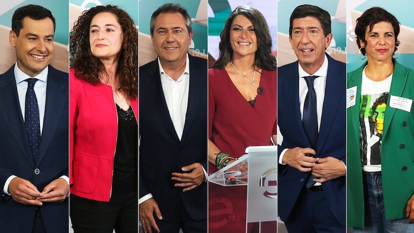 Los candidatos Juan Espadas, Juan Manuel Moreno, Juan Marín, Inmaculada Nieto, Teresa Rodríguez y Macarena Olona han participado en el último cara a cara de la campaña del 19-J