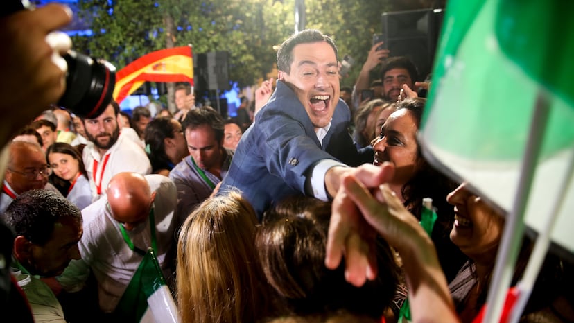 “Hemos hecho historia en Andalucía”. Juan Manuel Moreno arrasó ayer en las elecciones autonómicas de Andalucía y logró la primera mayoría absoluta del Partido Popular en la región. Los 58 escaños del PP, con un 43% del voto, son un hito en un feudo dominado por el PSOE desde la llegada de la democracia. Además, el PP desactiva el órdago de Vox, que pierde su capacidad de influir sobre el futuro Gobierno pese a subir dos escaños respecto a 2018. PP y Vox suman 72 escaños en el Parlamento andaluz frente a 37 de la izquierda en un resultado con clara lectura nacional. El PSOE cede 3 escaños y cosecha el peor resutado de su historia, con 30. Las dos candidaturas más a la izquierda, Por Andalucía y Adelante Andalucía, bajan de 17 a 7. Ciudadanos sufre otro descalabro y desaparece de la Cámara andaluza.