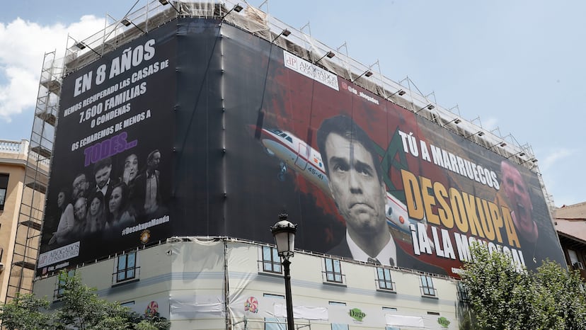 En el cartel de Desokupa, ubicado frente al metro de Antón Martín y en el que también aparece el logo del despacho jurídico dP Abogados consultores, se ve una imagen de Sánchez con cara de preocupación. Detrás de él, aparecen una fotografía del Falcon, el avión presidencial, y de la bandera de Marruecos. La lona cubre la fachada del edificio del que cuelga, y continúa por el lateral del mismo, en el que también hay otro mensaje que reivindica lo que Desokupa considera como sus logros. “En ocho años hemos recuperado las casas de 7.600 familias o condenas. Os echaremos de menos a todes”, se escribe en la lona, en referencia al lenguaje inclusivo que se usa para referirse a las personas no binarias.