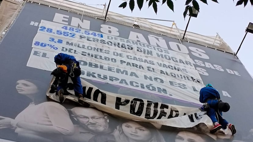 La polémica rodea al cartel desde que fue colocado hace cuatro días en un andamio de la calle Atocha, con un mensaje al presidente del Gobierno: “Tú, a Marruecos. Desokupa a La Moncloa”. Este mismo viernes, muy temprano, había sido boicoteado por activistas antidesahucios, agrupados en el Movimiento por la Vivienda de Madrid, que a las 6.30 colocaron encima sus propios carteles, con consignas como “el problema no es la okupación” o “482.549 desahucios”. La acción duró cuatro horas, porque las pancartas fueron retiradas sobre las diez de la mañana por la empresa publicitaria que desplegó la lona.