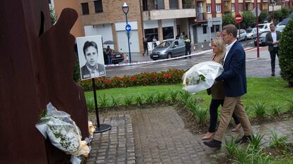 “Los seres vivos solo se van cuando se les olvida; nosotros jamás vamos a olvidar a Miguel Ángel Blanco”, ha comenzado diciendo Feijóo ante unas 300 personas de su partido congregadas en la plaza junto al monolito que recuerda al concejal del PP, que murió el 13 de julio de 1997. El presidente popular ha elegido Ermua para celebrar su principal acto electoral en Euskadi en torno a la figura de Miguel Ángel Blanco. Los dirigentes de este partido han colocado tres ramos de flores en su recuerdo y después han guardado un minuto de silencio. Este breve homenaje ha sido el prolegómeno de un mitin electoral que ha girado en torno a la memoria del pasado terrorista, a las víctimas de la banda y la política que aplicará el PP si Feijóo resulta elegido presidente.