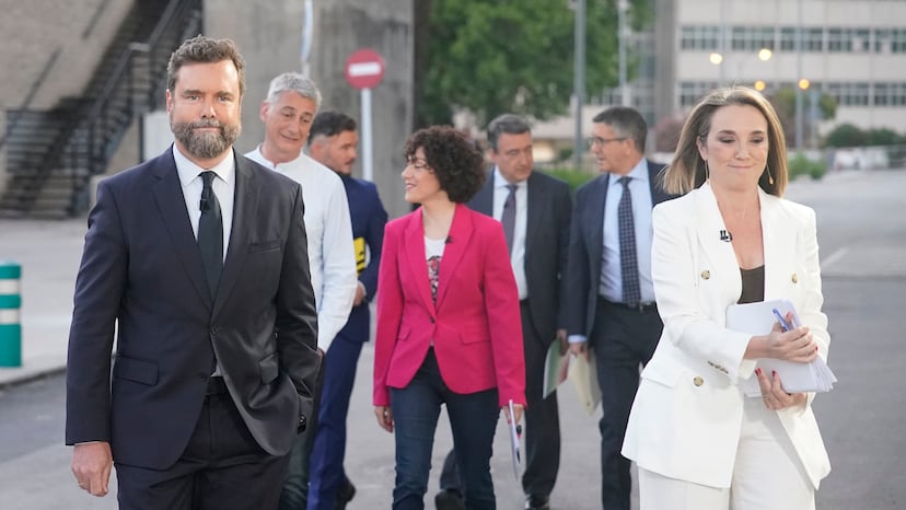 Cuando llegue la jornada de reflexión, el día 22, se habrá celebrado un cara a cara sin apenas propuestas electorales, un debate a cuatro en el que solo están previstos tres —por las calabazas del PP— y uno a siete, el de este jueves en RTVE, con los portavoces parlamentarios del PSOE, Partido Popular, Sumar, PNV, Vox, EH Bildu y ERC. Estas tres últimas formaciones han protagonizado la campaña de las generales y antes, la de las autonómicas, batiendo marcas de alusiones por parte de los dos candidatos con posibilidades de presidir el Gobierno: Pedro Sánchez y Alberto Núñez Feijóo. Los representantes de 320 de los 350 diputados del Congreso entraron en el estudio como una melé para repartirse 125 minutos —en cuatro bloques temáticos— y 18 cámaras. Y con todo, el debate, moderado por Xabier Fortes, fue más ordenado e incluyó muchas más propuestas que cuando el tiempo se dividía, cuatro días antes, entre dos.