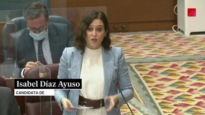 “Yo tengo que ser la media entre Feijóo y Ayuso”, declaró Pablo Casado esta semana. El propio líder del PP sitúa en dos extremos al presidente gallego y a la candidata a la presidencia madrileña, del mismo partido. Isabel Díaz Ayuso va por libre. Su discurso es el más próximo a Vox de todo el PP —los votantes de la formación ultra la prefieren a su propia candidata, según el CIS— y arrastra al presidente de los populares, quien ha vuelto a endurecer sus intervenciones tras plantar hace unos meses a Santiago Abascal — “hasta aquí hemos llegado”—. EL PAÍS ha analizado sus intervenciones en el Parlamento regional y sus mensajes de campaña. Este es el ideario de la favorita del 4-M según todas las encuestas y la nueva lideresa del PP.