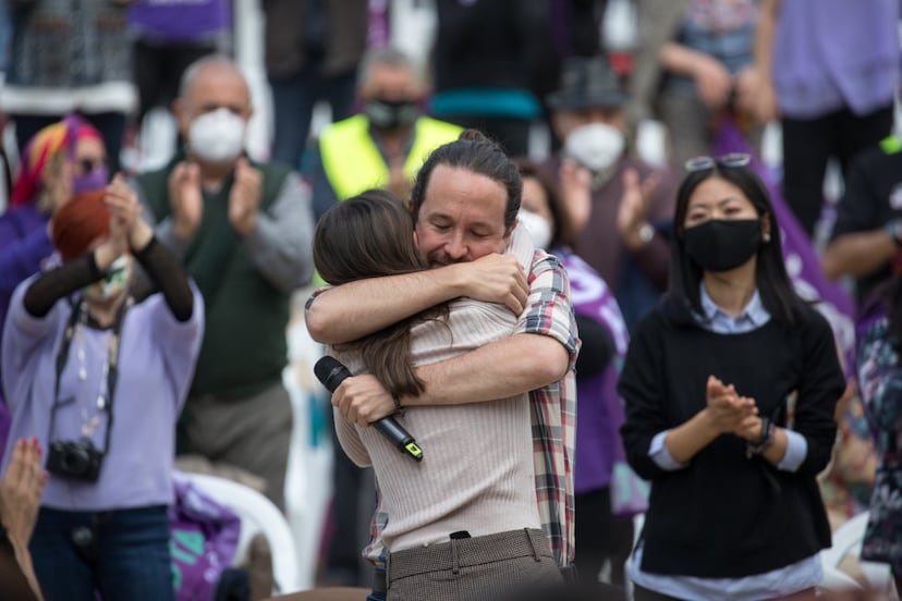 La ministra de Igualdad, Irene Montero, volcada en estos comicios, arropa también al candidato. Al terminar su intervención se produce una imagen poco usual en este tipo de actos. Iglesias y Montero, generalmente muy celosos de su intimidad, se abrazan y besan. El público comenta la escena y aplaude con ganas. El candidato de UP, que habla a continuación, afea a la presidenta de la Comunidad de Madrid, Isabel Díaz Ayuso, sus palabras un día antes, cuando afirmó que él venía “del mal”. “Es una irresponsabilidad en un contexto en el que hay amenazas de muerte”, critica.