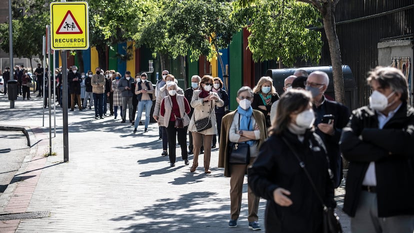 Las colas de esta jornada electoral en Madrid empezaron a formarse temprano. Ya había a las nueve de la mañana, con el arranque de los colegios, han seguido después y aún continuaban a primera hora de la tarde en muchos centros de votación. Pero las enormes filas, provocadas en parte por la distancia de seguridad que hay que mantener y los protocolos anticovid, avanzan rápido. Tienen un tiempo de espera por debajo de la media hora en el 77% de los colegios, según datos oficiales.