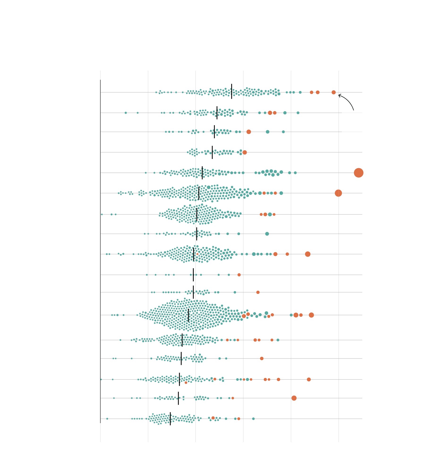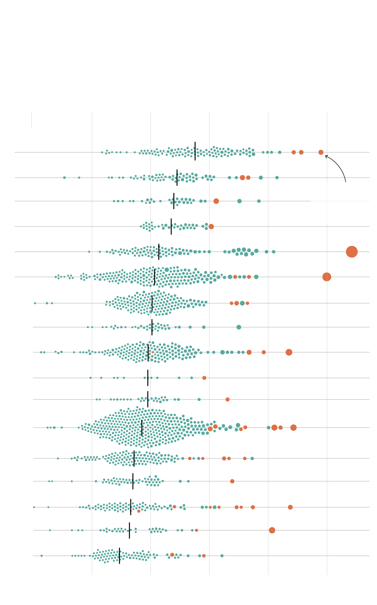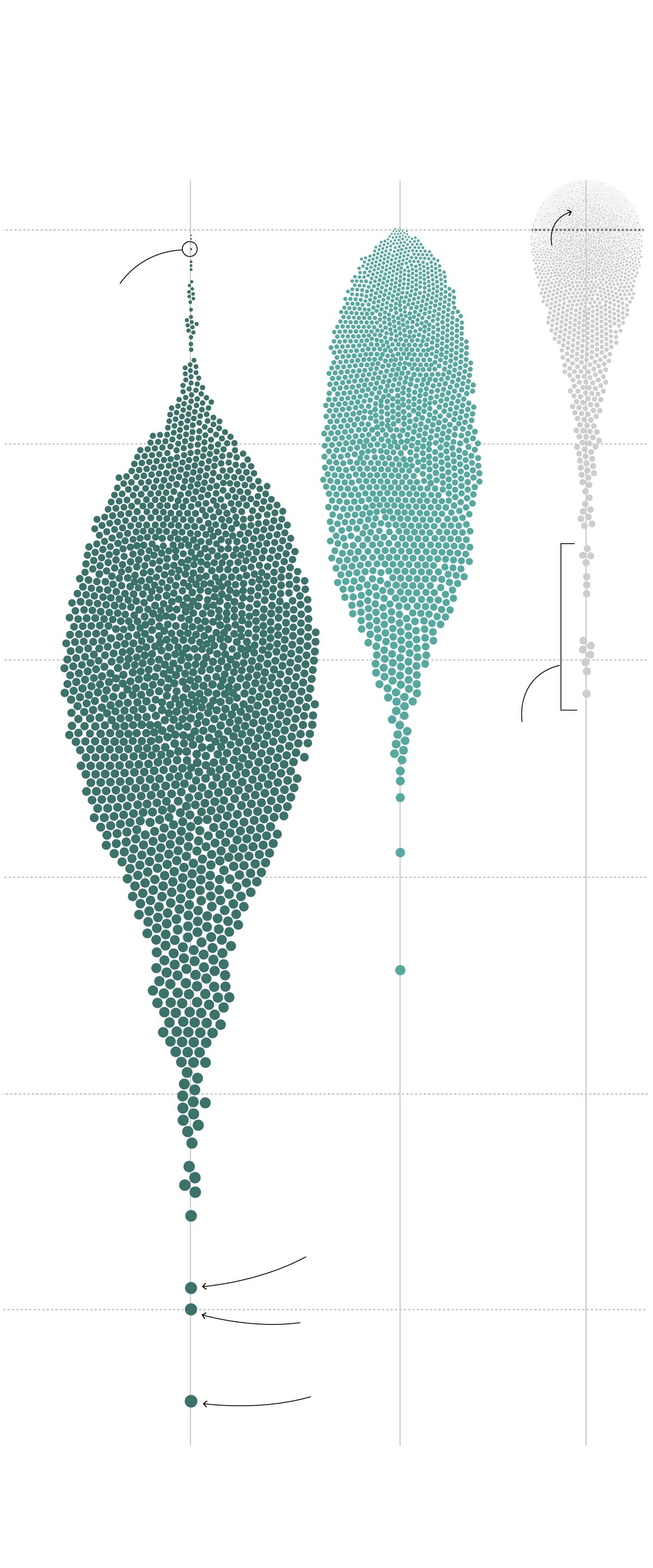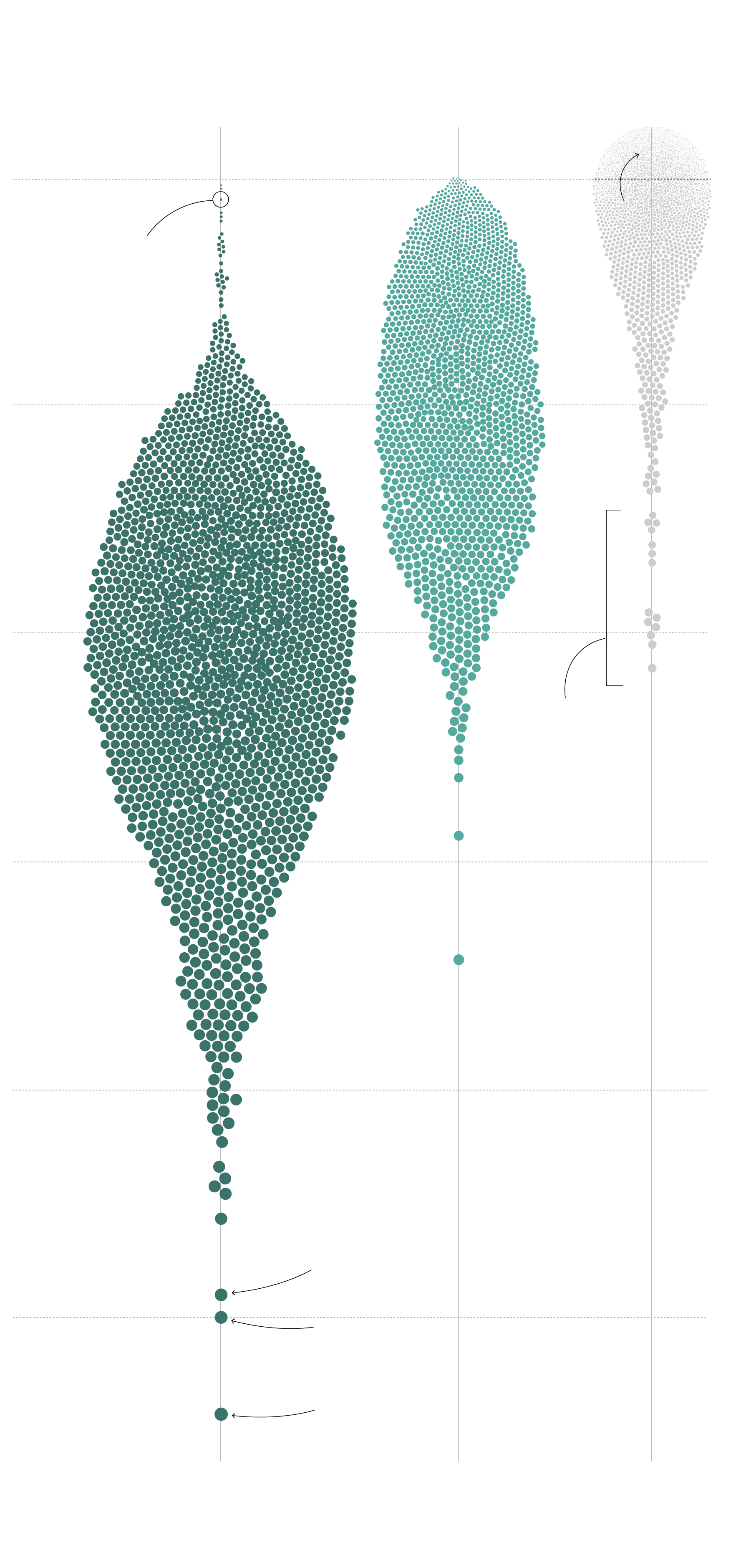 El tamaño de los círculos es proporcional al total de dinero percibido