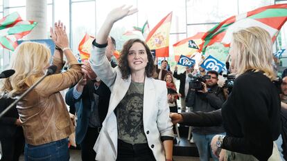 En ese guion tan medido y preparado, Ayuso ha sacado de nuevo el fantasma de la ilegalización de EH Bildu, que lleva reclamando días en contraposición y para malestar de la estrategia planificada desde la cúpula nacional de su partido. Para Ayuso, incluir a 44 exmilitantes de ETA, siete con delitos de sangre, en las lista de la coalición independentista obliga a que intervengan el Tribunal Supremo y los “más altos poderes legislativos y judiciales” del País Vasco, España y la Unión Europea. “Se deben pronunciar sobre esto. Si no lo hacemos, quizá nos arrepentiremos pronto”, ha afirmado.