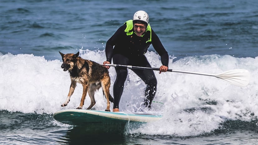 Wolfy, de cuatro años, surfea de manera natural; nadie lo forzó, empezó a hacerlo porque quería acompañar a José Mendiola, que también fue profesor de este deporte hasta que casi perdió la vida en un accidente. “A los perros, por lo general, no les gustan las olas. Les pasa como con algunos niños, que les resultan imprevisibles y no los controlan. No entienden por qué esa masa de agua se mueve y hace ruido”, explica este surfista vigués. “A Wolfy lo adopté con ocho meses, me acuerdo de que aún no tenía huevines y en Os Biosbardos tuve que dar mi compromiso de que lo castraría cuando creciese. Poco a poco empezó a mojarse, a nadar... lo llevaba de paseo en paddle surf hasta que quiso saltar a mi tabla”, relata. Tres años después, el perro pastor de olas nada más rápido que su propietario, que fue jugador de waterpolo, y entre las proezas del cánido está la de “haber cruzado a nado el Miño”, donde el río hace frontera entre Galicia y Portugal.