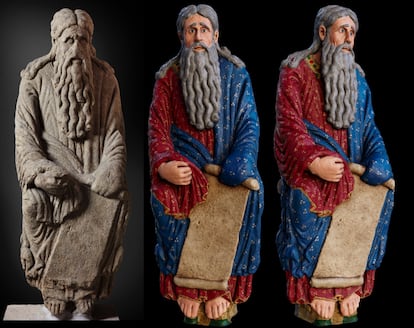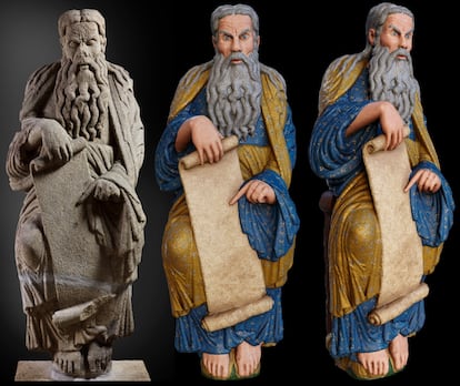 Tras el acto oficial de este jueves en el Museo do Pobo Galego, ahora no solo se pueden ver las esculturas, que ya habían formado parte de la exposición monográfica sobre Mateo que hace casi una década acogieron el Museo del Prado y la Catedral de Santiago y eran visitables en el BIC de Meirás. En la muestra preparada para recibirlas con honores se puede, entre otras cosas, imaginar cómo eran y dónde se ubicaban en el siglo XII estos profetas labrados en piedra. El investigador de la obra mateana Francisco Prado-Vilar, que trabajó en la restauración del Pórtico de la Gloria y resucitó digitalmente el desaparecido coro pétreo de la catedral, presentó un vídeo con su propuesta de reconstrucción íntegra de la fachada románica.