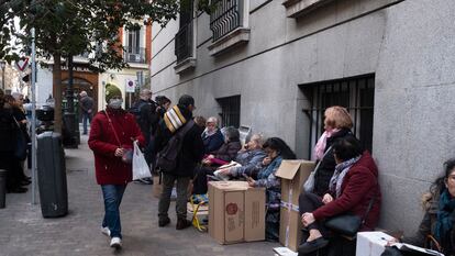A Pilar Peláez, una señora de 59 años, se le empañan las gafas. De un estuche rectangular saca un paño de microfibra que frota contra los cristales hasta que desaparece el vaho. La mujer tiene estampitas del Cristo de Medinaceli, medallas, bordados, sellos, e incluso su perfil de WhatsApp es un primer plano del rostro anguloso y bien proporcionado del Nazareno. Todo lo que compra, desde el móvil a una blusa, lo pasa por sus pies. Este año iba a frotar el cordón del traje de comunión de su nieto por el empeine de la talla, para eso lleva una semana haciendo la larga cola de sillas de plástico que se genera en la puerta de la basílica, pero el arzobispado de Madrid ha pedido a los fieles que no peguen sus labios a la madera para prevenir contagios por coronavirus. “Me da mucha pena porque yo tengo mucha fe. Estoy triste”, se lamenta, y el cristal de los lentes se le vuelve a enturbiar.
