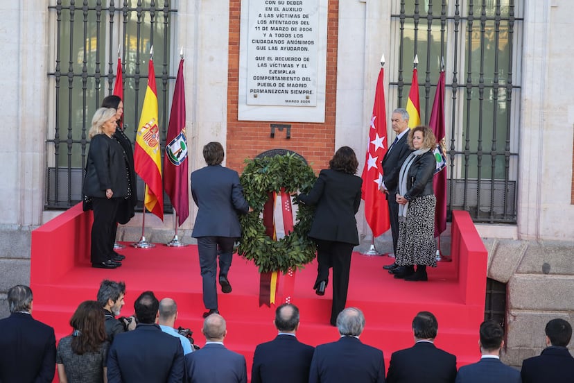 La Puerta del Sol era este miércoles por la mañana un erial. Poco tráfico y pocas personas deambulando por las calles aledañas. Una imagen insólita, derivada de las restricciones por el coronavirus, que ha extrañado a quienes se concentraban frente a la fachada del edificio de Correos, sede del Gobierno autonómico, donde se levantaba una esplendorosa plataforma roja que abrazaba a la placa de mármol blanco que recuerda a las víctimas del 11-M. Las campanas han comenzado a plañir a las nueve. Luego han aparecido la presidenta regional, Isabel Díaz Ayuso, y el alcalde de Madrid, José Luis Martínez Almeida. Ambos han desfilado de forma parsimoniosa por una alfombra, también roja, portando una corona de laurel que han depositado a los pies de la placa.