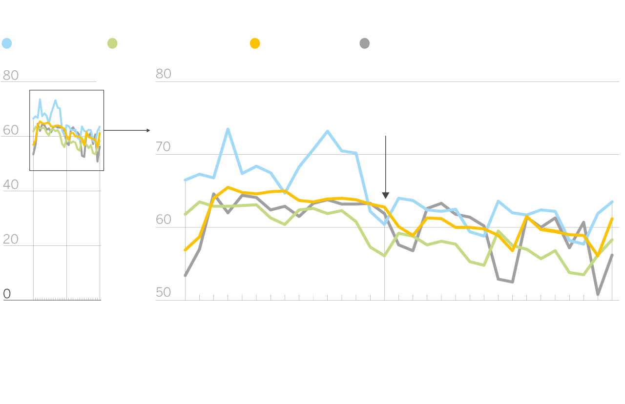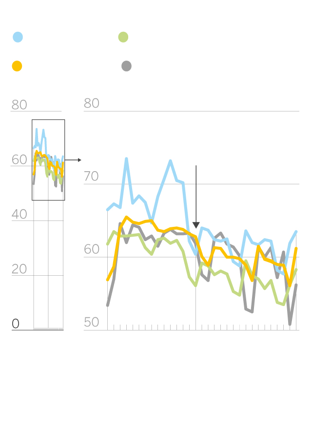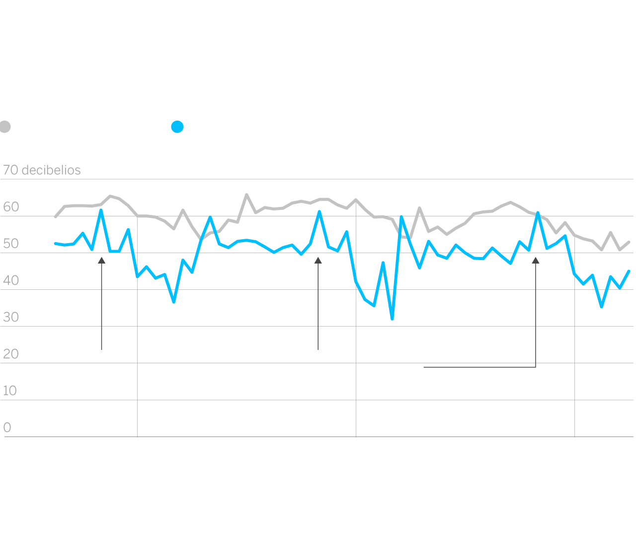 Los aplausos de las ocho de la tarde son un pico que sobresale cada día, llegando en ocasiones a superar los 82 decibelios de media por minuto. Después vuelve la calma. De madrugada, en algunas franjas horarias el descenso con respecto a las mismas fechas del año pasado ha sido de 30 decibelios de media por hora en la calle Velarde, donde se concentran cinco bares en menos de cien metros. “Nos parece casi un sueño. Es un silencio sísmico”, dice Jordi Gordon, portavoz de la campaña SOS Malasaña, Vecinos en peligro de extinción.