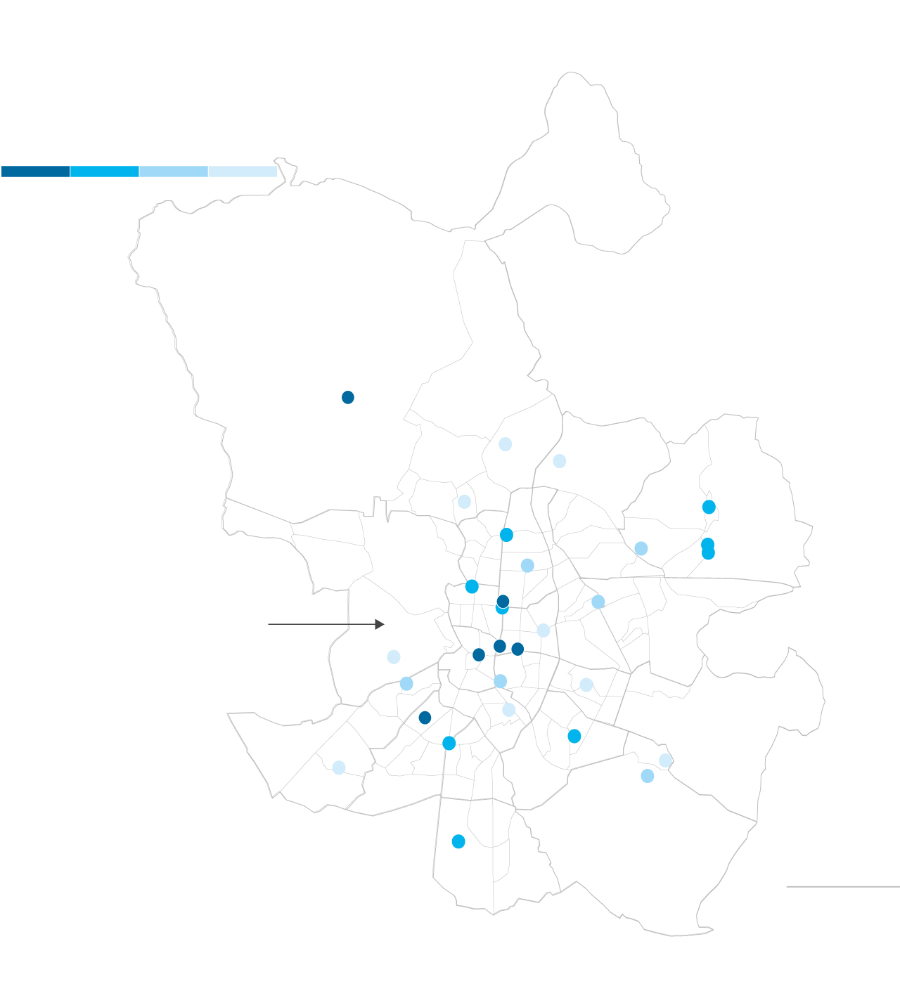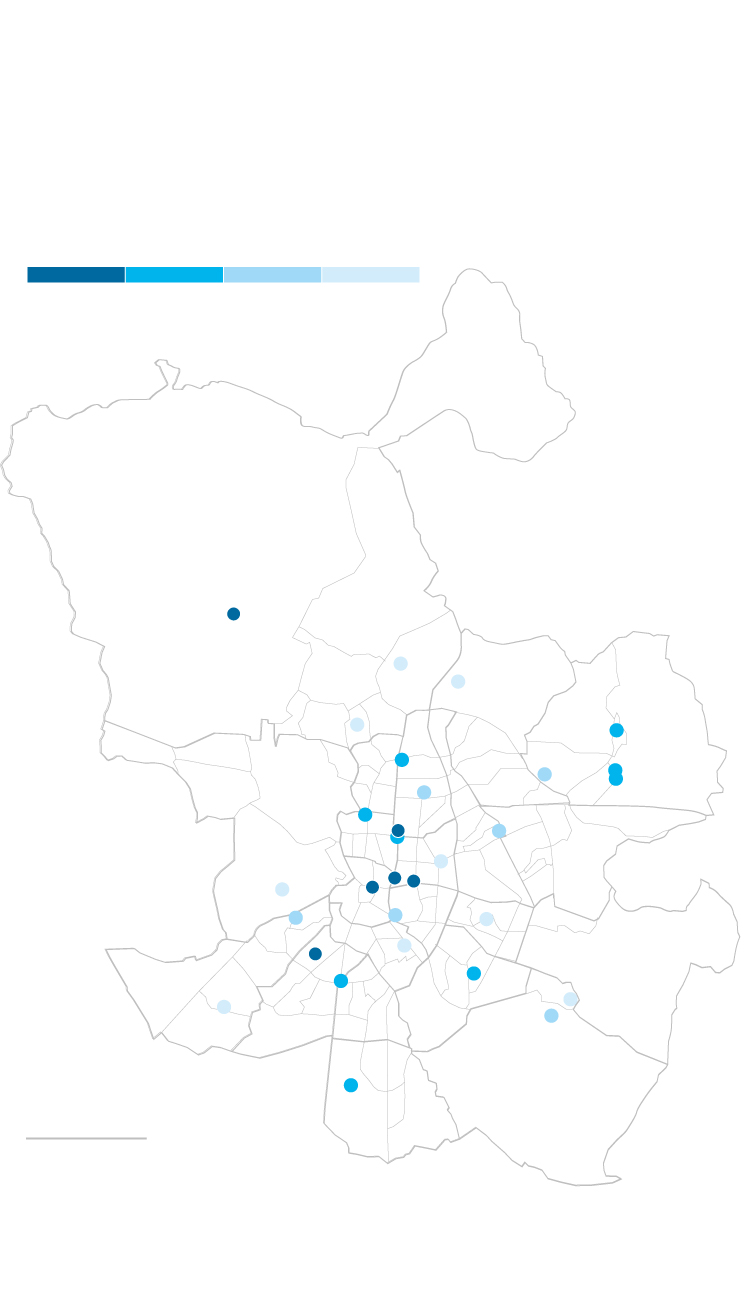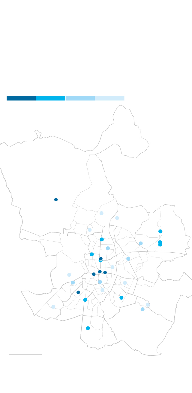 Los sonómetros de la red fija del Ayuntamiento de Madrid, colocados en lugares de tráfico intenso, indican que con respecto a las mismas fechas del año anterior cae más el ruido dentro de la almendra central (dentro de la M-30). El primer día con las actividades esenciales paralizadas, el martes 31, la caída rondó el 5%. Las mayores diferencias se han notado los fines de semana. Por ejemplo el sábado 28 de marzo la presión sonora descendió de media en todo el día 13,5% en el medidor de Escuelas Aguirre, entre la zona comercial del distrito de Salamanca y el Retiro (de 65,8 a 56,9 decibelios). La caída fue de 13,1% en el medidor de Paseo de Recoletos, unos pocos metros al norte de la Cibeles (de 67 a 58,2 decibelios). En los barrios periféricos de la capital se nota menos el descenso. En el del Pilar la bajada fue de 6,7% (de 60,1 a 56,1 decibelios).