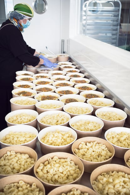 Llegó de Miami hace dos semanas, muerta de miedo e ilusión en un avión con solo seis pasajeros. Desde entonces, trabaja 13 horas al día en la Escuela de Hostelería Santa Eugenia, la mayor cocina solidaria que ha montado la ONG World Central Kitchen. El cocinero asturiano José Andrés creó hace 10 años esta plataforma para alimentar a personas en lugares azotados por catástrofes naturales o personas en riesgo de exclusión. En España instaló el dispositivo el grupo Arzábal el 27 de marzo y solo en Madrid se han sumado a la iniciativa las cocinas de DSTAgE, Medems Catering y El Qüenco de Pepa en el NH Eurobuilding.