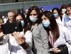 Durante las dos horas que ha durado la convocatoria, y a lo largo de todo el recorrido, personal sanitario, periodistas, políticos, cámaras de televisión y fotógrafos se amontonaban en los distintos puntos que la comitiva política iba marcando, sin dejar espacio para los dos metros de distancia física que insistentemente ha recomendado el Ministerio de Sanidad como una de las medidas más necesarias para evitar la expansión de la pandemia.