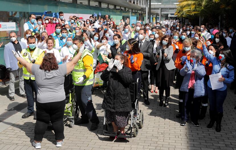 Desde el 21 de marzo, unos 4.000 contagiados han pasado por este centro sanitario de emergencias. Este viernes ha visto salir a sus cinco últimos pacientes, cuatro mujeres y un hombre. Gloria fue la más aplaudida. 52 años, más de tres semanas intubada en una de las 13 camas de UCI que se montaron en Ifema. Salió en silla de ruedas entre el aplauso de los sanitarios, y, con el oxígeno todavía conectado, se levantó para el minuto de silencio que la Comunidad celebra cada día en honor a los fallecidos por la pandemia. Después, también cada día, suena el himno de España.