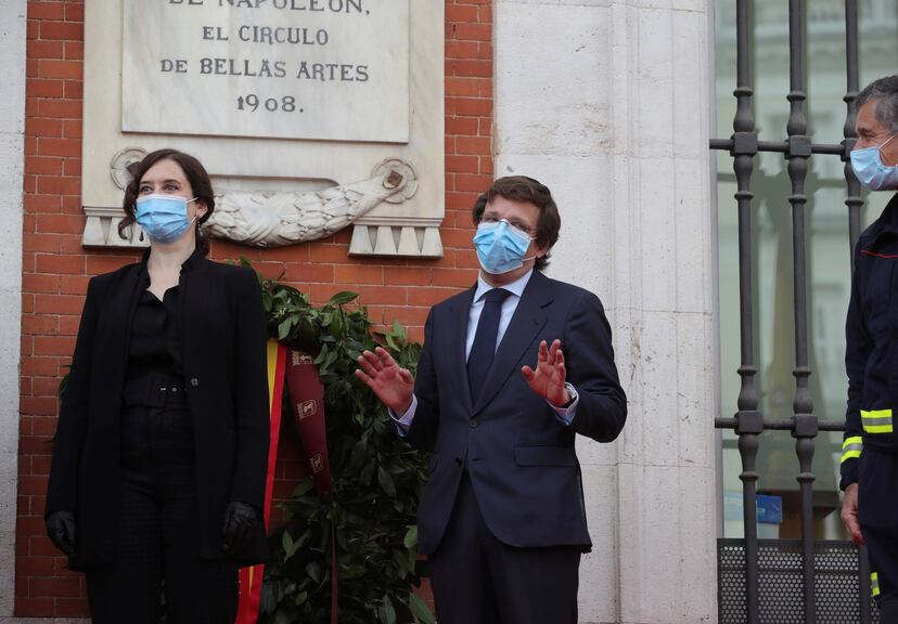 El primer Dos de Mayo de Isabel Díaz Ayuso como presidenta de la Comunidad de Madrid ha sido un Dos de Mayo de luto: un homenaje a quienes luchan contra la expansión del coronavirus y a quienes han caído víctimas de la enfermedad. Nada de canapés, cervezas y corrillos de políticos y periodistas abarrotando la Real Casa de Correos, como es tradición. Al contrario. De los héroes de 1808 a los de 2020, aplausos dolidos, luto negro en los trajes, las corbatas y las solapas, y ojos tristes enmarcados sin excepción por mascarillas. Y disculpas: Isabel Díaz Ayuso, José Luis Martínez Almeida, Ignacio Aguado o Begoña Villacís han lamentado el multitudinario acto de cierre del hospital de Ifema, organizado el viernes, al que acudieron cientos de personas sin respetar la distancia física, lo que ha provocado una investigación de la Delegación del Gobierno.