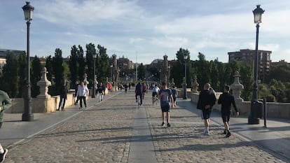 El Puente de Toledo, con sus nueve ojos y sus 180 metros de largo, era un ir y venir constante de runners, ciclistas, paseantes. Si el ancho ya de por sí es reducido, un coche patrulla circulaba de punta a punta vigilando los excesos y reduciendo aún más el espacio para hacer ejercicio. El debate de la mayoría de los ciudadanos estaba en la reapertura de los parques. Jose Luis y Paloma, 48 y 52 años, salieron de casa a las 9.30. Dicen que a las 7.00 muchos ciudadanos se saltaron la prohibición y accedieron al parque. “Lo tienen que abrir. Es necesario para evitar las aglomeraciones”. La patrulla policial, no obstante, volvió a activar el altavoz ante la afluencia de gente cruzando el puente: