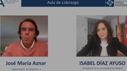 Da igual que les separen 25 años en la vida y en la política. José María Aznar e Isabel Díaz Ayuso, pasado y presente del PP más duro, defensores de los pactos con Vox y críticos sin matices con el Gobierno de Pedro Sánchez, han demostrado este lunes sus coincidencias desde la primera frase pronunciada en un encuentro telemático.
