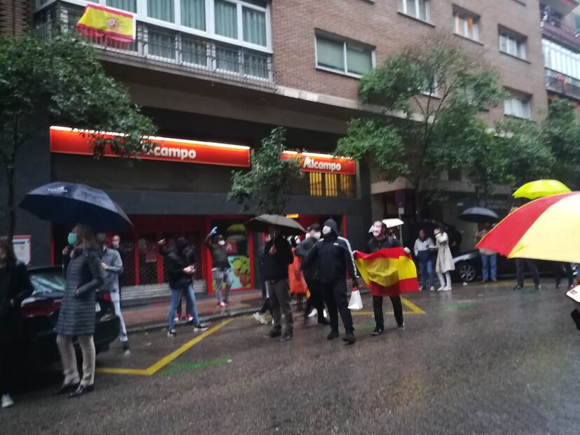 Cerca de 100 personas se han reunido este martes al anochecer en la céntrica calle Núñez de Balboa para protestar contra el Gobierno de España, según explicaron varios participantes. Manifestantes con banderas de España han gritado “Gobierno dimisión” y “libertad” durante media hora, desde las 21.00 horas, coincidiendo con la cacerolada desde los balcones. Sobre las 21.30 horas ha llegado un coche de la Policía Municipal y el grupo se ha dispersado.