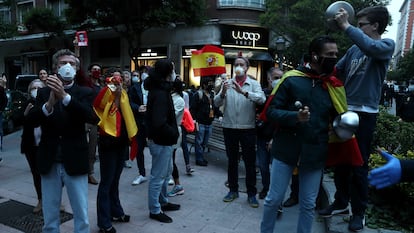 “Gobierno dimisión”. “Libertad”. “Prensa comunista”. Media hora después, tras el breve aplauso sanitario, alrededor de 100 vecinos comenzaron a salir de los portales con cacerolas por la calle. También se acercaron de otras vías. Y de otros barrios. La mayoría subía y bajaba por las aceras, que miden tres metros. Con mascarillas, sin ellas, con banderas de España, con perros con banderas de España. Familias, jóvenes, mayores.