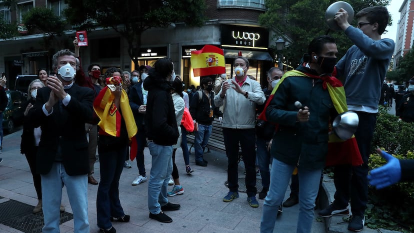 “Gobierno dimisión”. “Libertad”. “Prensa comunista”. Media hora después, tras el breve aplauso sanitario, alrededor de 100 vecinos comenzaron a salir de los portales con cacerolas por la calle. También se acercaron de otras vías. Y de otros barrios. La mayoría subía y bajaba por las aceras, que miden tres metros. Con mascarillas, sin ellas, con banderas de España, con perros con banderas de España. Familias, jóvenes, mayores.