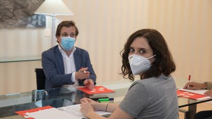 Los madrileños no pueden estar “eternamente encerrados”, entiende la presidenta de la Comunidad de Madrid, que ha defendido un necesario de despegue de la economía al tiempo que los ciudadanos se habitúan a vivir con una pandemia todavía presente. “El virus sigue” pero “la vida sigue también”, ha añadido Isabel Díaz Ayuso en una comparecencia junto al alcalde de Madrid, José Luis Martínez-Almeida, para plantear las líneas básicas de la entrada de la región en la fase 1 el próximo lunes. Ahora es el momento de los “sanitarios de la Economía”, aquellos que han de ayudar a salir de la profunda crisis en la que se encuentra inmersa la región por culpa de la pandemia. Pero, recuerda la presidenta, “libertad y responsabilidad van de la mano”, en advertencia directa hacia unos ciudadanos que en unas horas verán reducidas sus restricciones. La emergencia económica y social es “demoledora” ha destacado el alcalde.