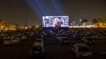 Ismael, de 43 años, fue al autocine con sus amigos antes del confinamiento y allí conoció a Valeria, de 24 años. Quedó flechado, pero después llegó la pandemia y todo se enfrió. El retorno del cine sobre cuatro ruedas a Madrid hizo que en la noche del miércoles se volvieran a encontrar de casualidad. “Esa chica rubia me encanta, pero la diferencia de edad me hace sentir que somos de diferentes especies”, afirma Ismael.