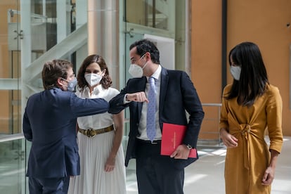 Para afrontarlas, Díaz Ayuso se reunió este jueves con Aguado, el alcalde de la capital, José Luis Martínez Almeida, y la vicealcaldesa, Begoña Villacís. Los cuatro acordaron mantener una comunicación constante “en los próximos meses” para evaluar las medidas que se adopten. No hubo, sin embargo, notificación alguna a Ángel Gabilondo, líder del PSOE y la oposición.