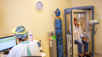 Silvia González está en la consulta con las vías preparadas y la máquina a punto para hacerle una extracción de sangre y las pruebas funcionales respiratorias, unos ejercicios que miden la capacidad de los pulmones para introducir y liberar aire. Algo que durante más de un mes él no pudo hacer por sí mismo. Después de llenar los nueve tubos que necesitará para el análisis de sangre, la enfermera le pide que se quite la mascarilla y se siente en la máquina con la que va a hacerle los exámenes respiratorios.
