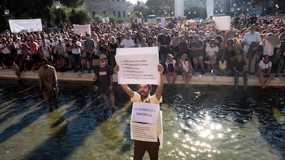 Durante varias horas, los manifestantes han tomado la plaza al grito de “queremos ver el virus”, “bote, bote, bote, aquí no hay rebrote”, “no hay miedo”, “libertad, libertad”, “lo que mata es el 5G”. A la manifestación se ha unido el agricultor antivacunas Josep Pàmies, que ha instado a los presentes a ir a los barrios y a los pueblos a convencer a la gente de que el coronavirus no les debe preocupar. También estuvo presente la poeta y fotógrafa Ouka Leele, que ha invitado a la gente a quitarse el miedo al virus y respirar. “Para estar sanos tenemos que vivir, no podemos vivir como zombis con mascarilla por las calles”, ha afirmado Leele.