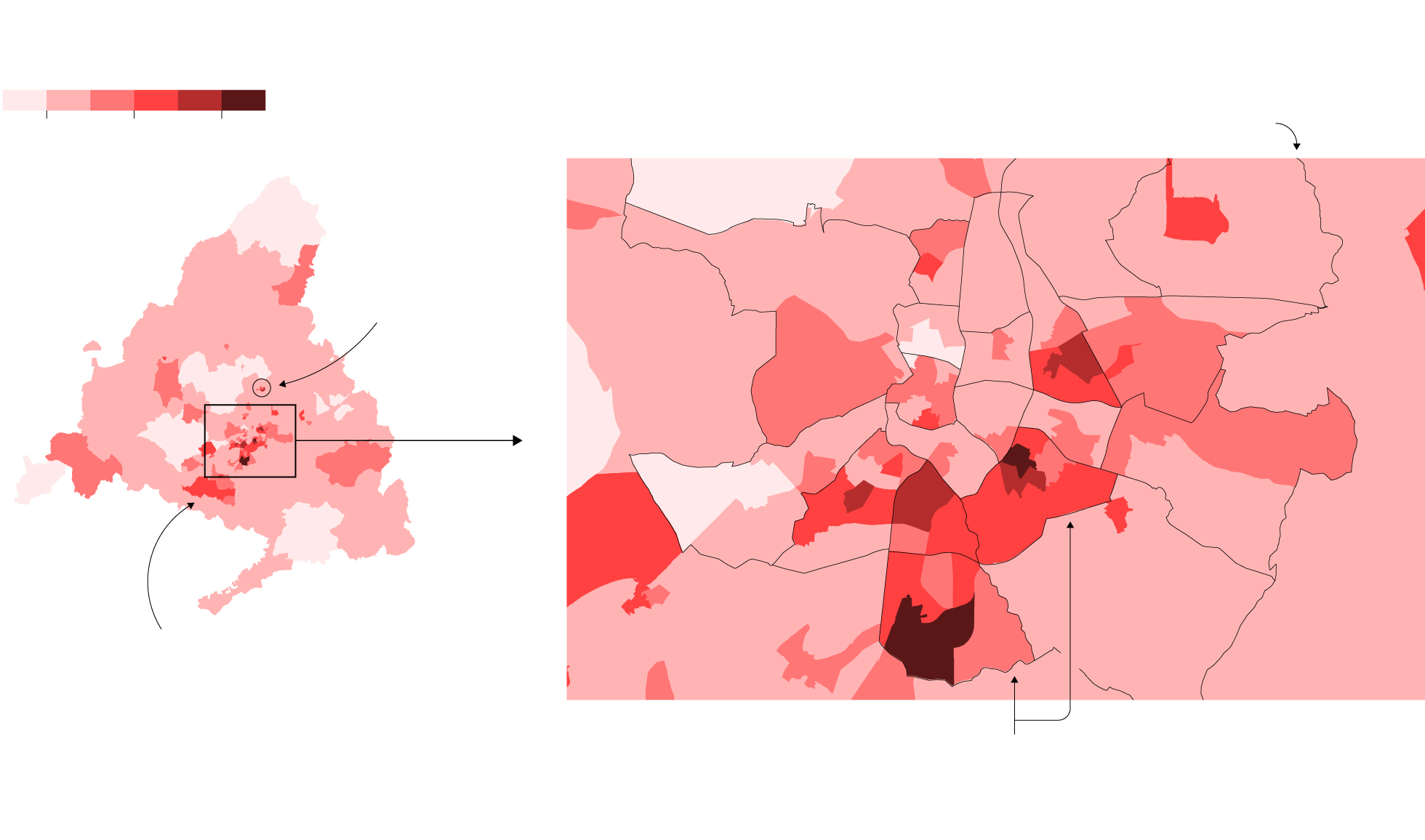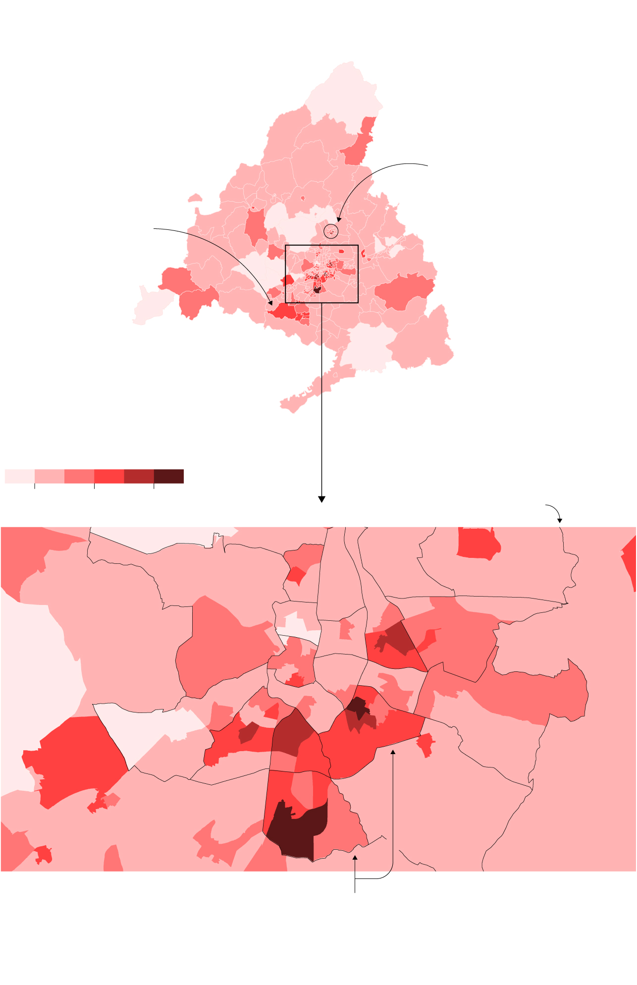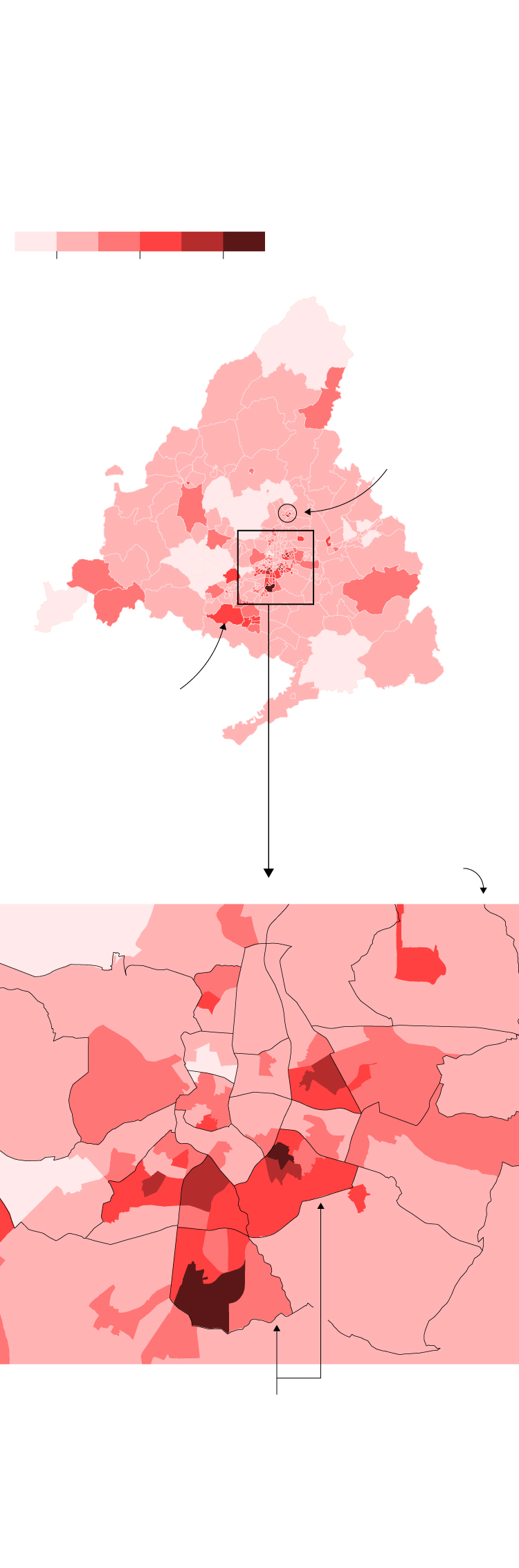 En los barrios más pobres se vive peor, hay más contagios y es más probable que crezca la mortalidad: se trata de un patrón global y ya estudiado, antes y durante la pandemia de covid-19, desde Singapur a Chile pasando por Estados Unidos. En Madrid, hoy, se puede observar a pequeña escala y en tiempo real.