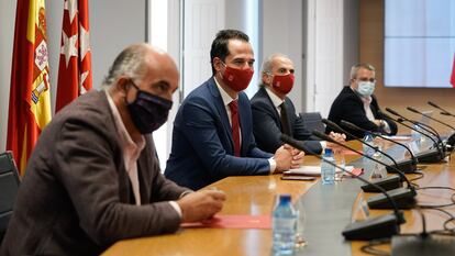 La reunión, que ha acabado con acuerdo, ha comenzado a las seis de la tarde en el edificio de la Vicepresidencia del Gobierno de Madrid, la casa de Ignacio Aguado, de Ciudadanos, que cogobierna la comunidad con el PP, y ha terminado pasadas las dos horas. El líder de Ciudadanos en la región se distanció en los últimos días de la batalla mediática entre La Moncloa y la Puerta de Sol. Anoche se anotó un tanto político con este acuerdo. Algunas voces dentro de los populares empezaron a sugerir tímidamente en privado a principios de semana que se deberían aplicar más medidas para doblegar la curva de contagios en la región. “Nosotros no lo descartamos”, insistieron anoche en el entorno de Díaz Ayuso; “pero vamos a ir paso a paso. No se puede cerrar Madrid. Eso sería lo más fácil. Hay que conjugar el equilibrio entre la economía y la salud”, responden en la Puerta del Sol.