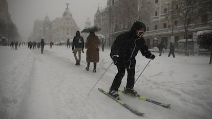 La gente también quiere divertirse. La Castellana se convierte en una estación de esquí improvisada. Se lanzan paseo abajo y cuando llegan a Atocha cogen el metro de remonte, para que los deje de nuevo en la cima, en plaza de Castilla. El abono actúa de fortfait.