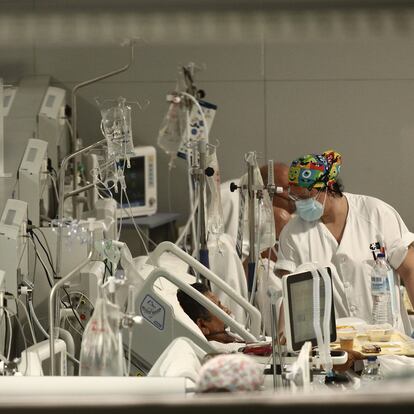En las unidades de cuidados intensivos la crecida es mayor, y más grave. En ellas están ya todas las miradas porque de su margen de maniobra depende no solo el resto del hospital sino la vida de los pacientes con la infección más agudizada. El pasado 15 de enero había 472 críticos en UCI, según el informe diario de la Consejería de Sanidad, un 100% de ocupación; según los últimos datos que ha publicado este viernes la Sociedad de Medicina Intensiva de Madrid, hay 612 enfermos en sus camas. Es decir, que ya operan al 130% de su capacidad, la estructural, sin contar quirófanos, unidades postquirúrgicas o de reanimación o cualquier otra zona reconvertible para tratar a estos pacientes, los que no pueden respirar por sí mismos. Las semanas que quedan por venir, decía este jueves el vicepresidente de esa sociedad médica, Daniel Ballesteros, van a ser “pavorosas”. Con esos mismos datos, el viceconsejero Zapatero afirmó esta tarde que “la situación no es crítica si la comparamos con la primera ola”.