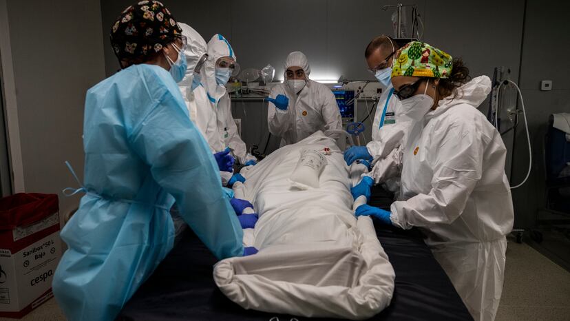 Varios profesionales se mueven como un enjambre alrededor de una cama. Están preparando el traslado de un enfermo a la unidad de críticos, apenas a unos metros. Todo el procedimiento lleva alrededor de una hora. En la UCI, el intensivista Borja Ruiz Mateos será uno de los que se haga cargo de ese nuevo paciente, al que espera poder sacar de allí lo antes posible, si todo va bien. Si se complica, y entre otros procedimientos, podría acabar por ser pronado, es decir, colocado bocabajo, exactamente como el hombre que se atisba, bajo sábanas y tubos y cables, detrás del facultativo. Acaban de darle la vuelta entre media docena de especialistas. “Estará así entre 16 y 24 horas, a veces más; pero es lo que mejora la oxigenación, la mejoría es muy rápida y visible en horas”, dice Ruiz Mateos.