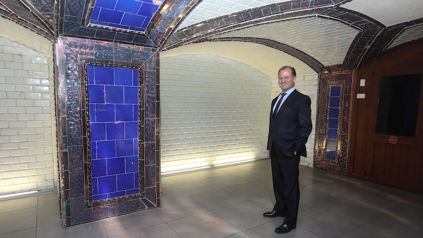 El vestíbulo de la antigua estación de Pacífico comenzó a prestar servicio a los usuarios en 1923 hasta su cierre en 1966. Su restauración empezó en 2007 y terminó 10 años después, por lo que estuvo abierto al público durante un tiempo muy corto antes de que la pandemia obligara su cierre. Ahora su esperada reapertura recupera la decoración original diseñada por Antonio Palacios (1874-1945). “El azul fue algo novedoso en ese momento”, explica González, el responsable de ‘Andén 0′.