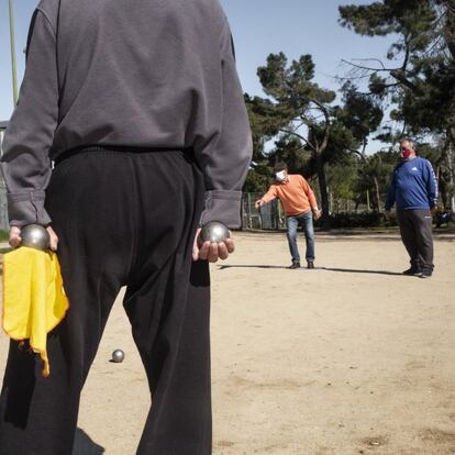 La estampa se repite un martes por la tarde a nueve kilómetros, en el Parque de Lisboa (Alcorcón). Dos grupos de hombres mayores practican la petanca allí donde otros pasean al perro, salen a correr o practican yoga. Antes del año pandémico estos señores frecuentaban un hogar del jubilado muy próximo, en el que las mañanas transcurrían entre el mus, el villar o el dominó. Los miércoles se celebraba un baile en línea, de cara al profesor, cuyos movimientos replicaban con energía. Pero todo aquello se acabó, al menos por ahora. “¡Esta sí que vale, prenda!”, exclama Fernando Herráez, de 81 años, cuando la bola que arroja su colega consigue alcanzar el boliche rojo. Se diría que este es un juego anodino, pero él le añade épica: “Yo soy El Destructor, me encargo de romper la formación contrincante”.